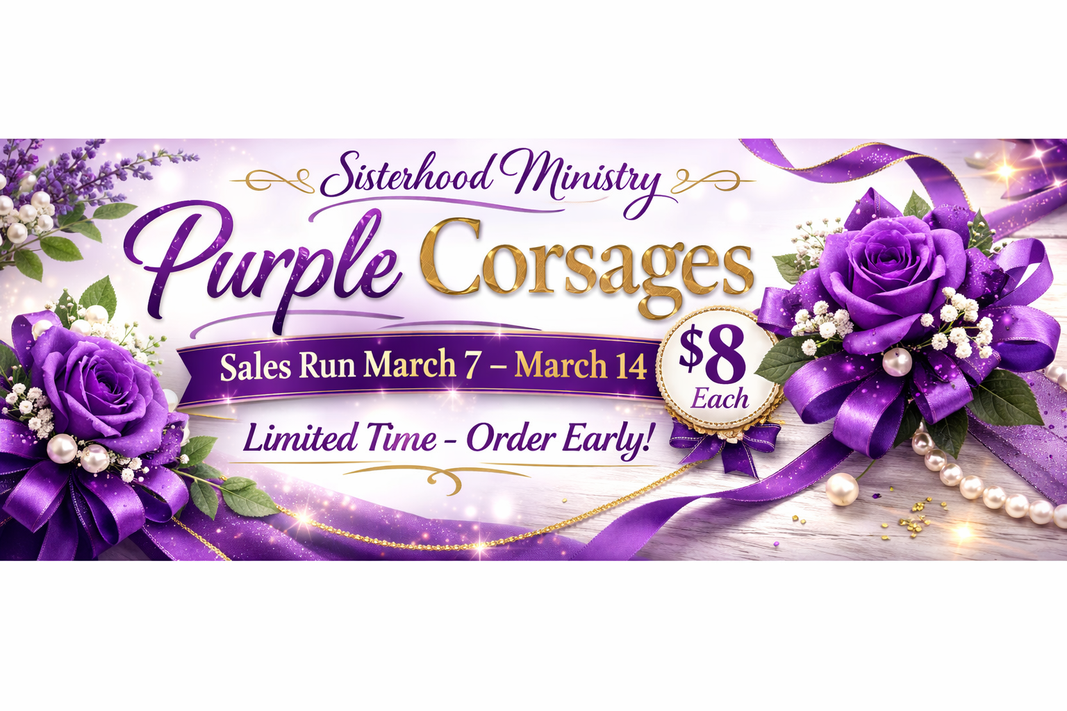 Support the Sisterhood Ministry by purchasing a Purple Corsage for $8. Online ordering opens March 7 and closes March 14, 2026.